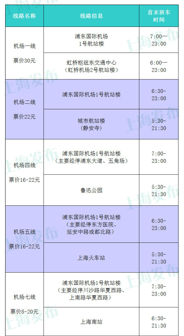 上海机场梳理了16条往返上海两大机场地面公交,目的地涵盖世纪大道地铁站、人民广场、静安寺、五角场以及火车站等重要交通枢纽。看下表了解更多详情吧!