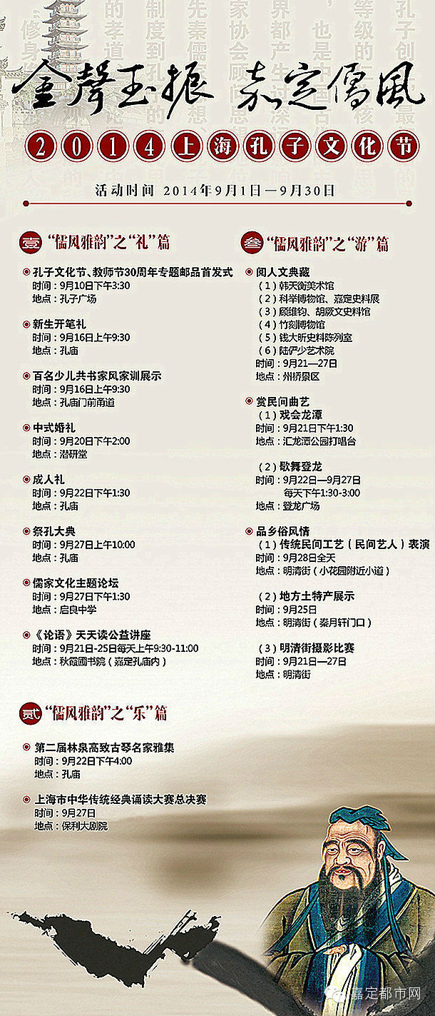 2014上海孔子文化节将于9月份在“教化嘉定”盛装亮相。今年孔子文化节活动时间将从9月1日起,到9月30日结束,主题为“金声玉振、嘉定儒风”,活动将融合礼乐文化、传世家训、师道传承、经典吟诵等元素从“礼”、“乐”、“游”三大篇章展开,通过16项主题活动向市民游客展示嘉定深厚的历史底蕴和儒家文化的独特魅力。