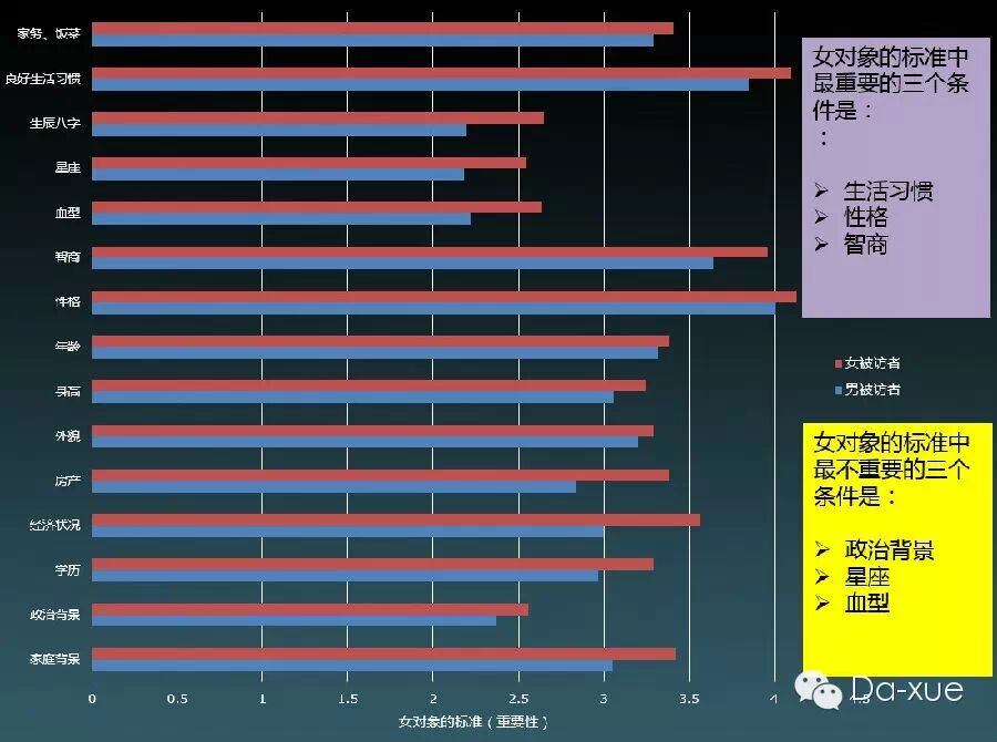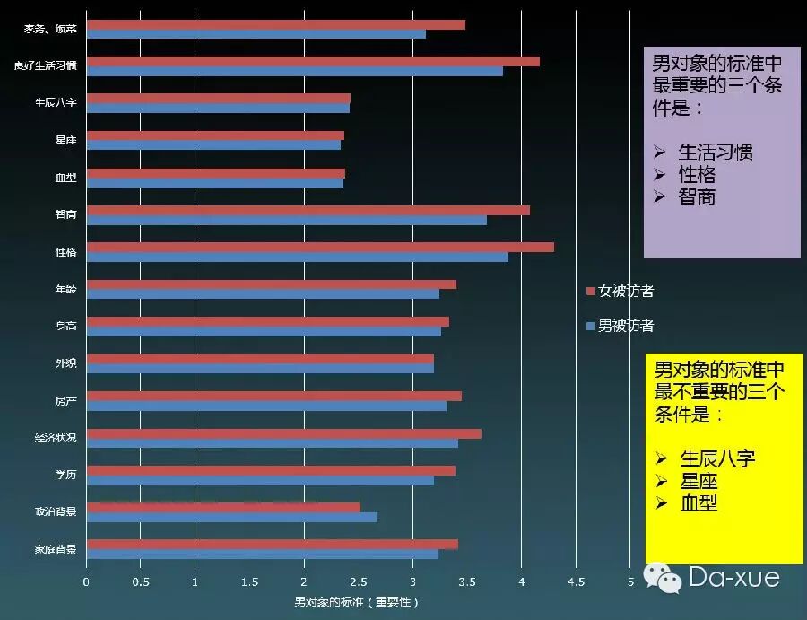 ★ 女选男:最看重生活习惯、性格、智商;最不看重生辰八字、星座和血型。