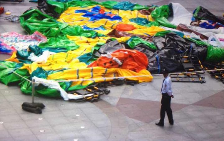 今天(5日)中午1:40左右,上海杨浦区宝地广场门前,一阵大风吹翻充气城堡,二三十个孩子有的被抛向空中,摔在水泥地上,有的被卷入城堡,压在“城堡山”下。事故中共有13名儿童和1名青年送医治疗。