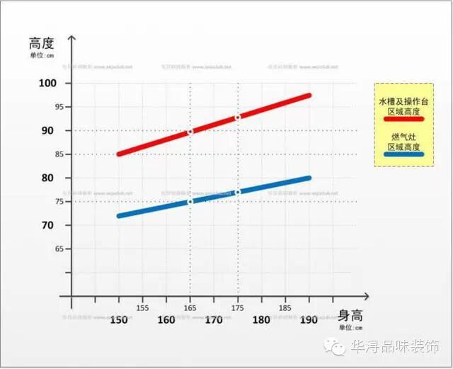 橱柜工作区台面的两个高度设计,建议根据家庭中主要下厨人员的身高,参考下图: