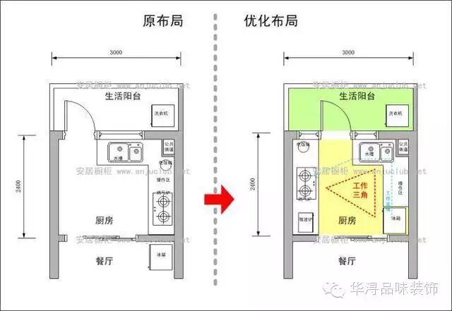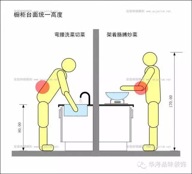 根据人体工程学原理,及厨房操作行为特点,橱柜工作区台面,应划分为不等高的两个区域。水槽、操作台为高区,燃气灶为低区。