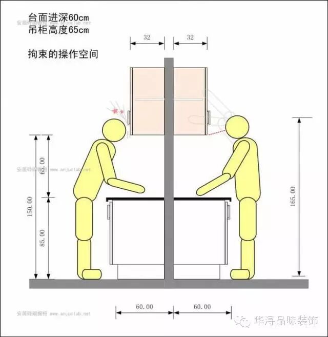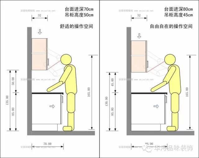 吊柜高度吊柜是厨房储物空间的重要组成。吊柜布置高度,同样决定了取放物品的便捷性。通常情况下,吊柜的便捷使用跟工作区操作自由舒适是冲突的。如果吊柜高度布置较低,方便取放东西,但同时压缩了操作区上空空间,影响视野,使操作压抑拘束,头部容易碰到柜门。吊柜高度设置较高,取放东西又不方便。当前,大多数成品橱柜操作台标准进深为60cm,吊柜距离操作台高度为65-75cm是一个权衡的数值,加上操作台高度后,总高度通常为150—160cm左右。但吊柜使用的便捷性、工作区操作的舒适性都仍然较差。