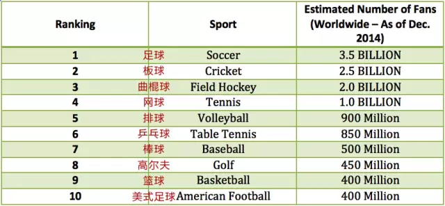 第一名的足球拥有35亿球迷。而乒乓球、棒球、高尔夫、篮球和美式足球则排在排球之后,分别列第六到第十位。其中篮球的球迷在全世界大约有4亿。