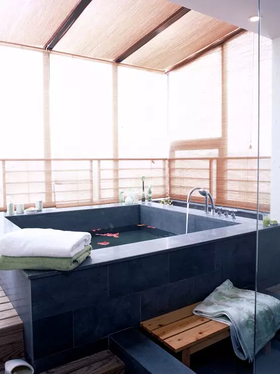 ▎盥洗室的设计别具一格,将原本的露台改造成为用抛光的青石板围成的浴池,池边再用防腐木地板做成踏步,别有一番度假酒店般的惬意感觉。