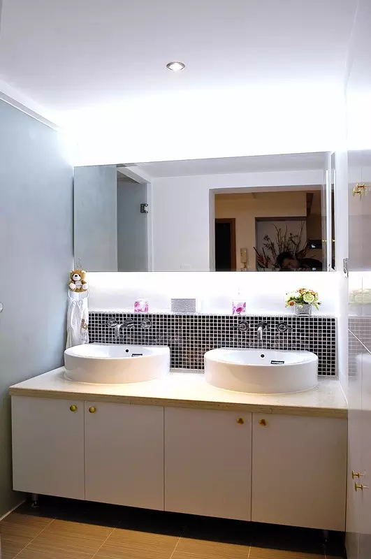 这套案例的原始房型设计就是卫浴间与餐厅共用一面墙体,但餐厅的面积并不大。因为卫浴间的空间比较充裕,所以设计师将墙体改造成弧形来扩大餐厅的使用面积。